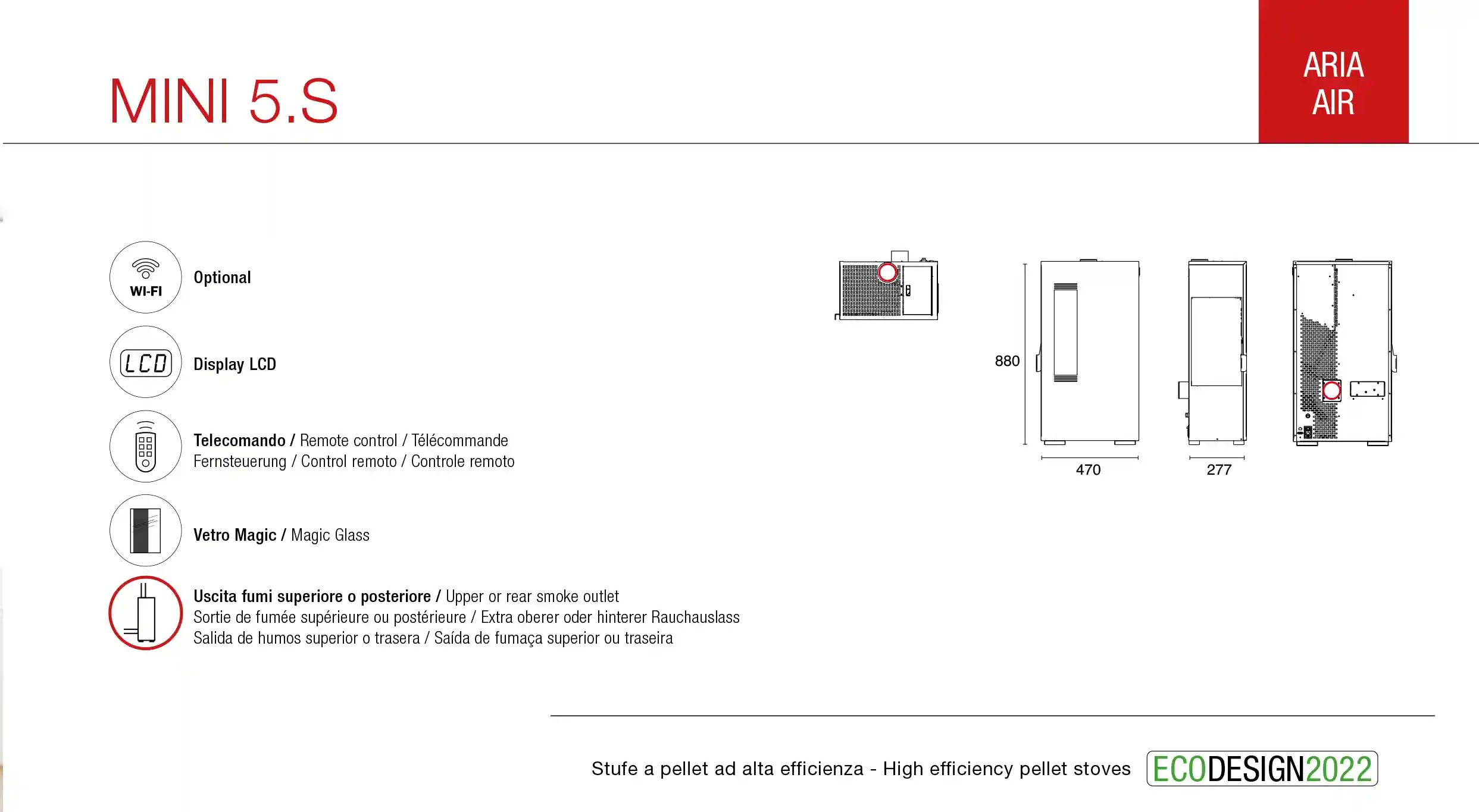 MINI Pelletofen ist ein Ofen mit kompaktem und minimalistschem Design, dr mit Holzfüßen und „magischem“ Glas vrziert ist. Dank der Anzeigeeinstellungen, die den Gesambetrieb verwalten passt sich dieser Ofen perfekt dem modernen Lebensstil an.