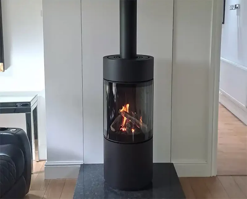 Passo Gas-Ofen  robuste, freistehende Gaskamin fällt durch sein großes rundes Glasfenster auf. 180 Grad-Sicht auf die Flammen.