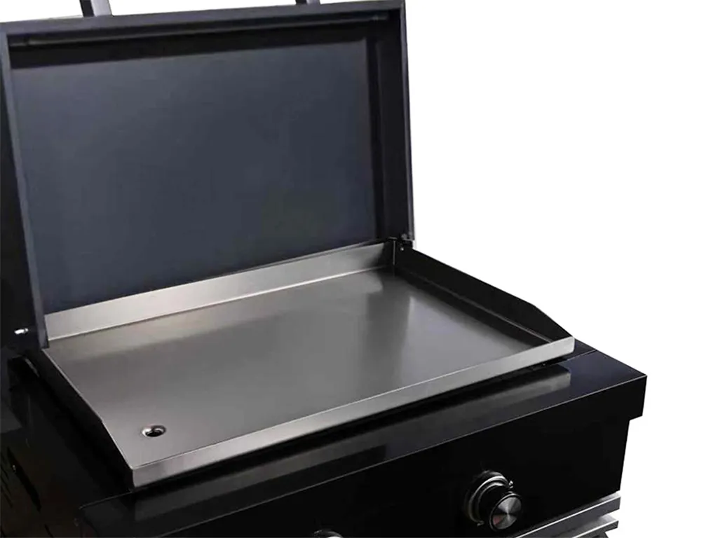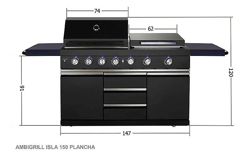 Barbacoa Isla ambigrill 150 Plancha. Robusta barbacoa fabricada con materiales de primera calidad y cuerpo de acero aluminizado. Además la amplia plancha en el lateral puede retirarse y dispondra de dos fogones para cocinar con sarten o cacerolas. Ideal para combinar con cualquier otro producto de esta gama.