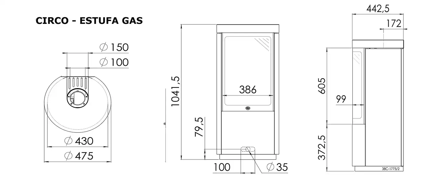 Circo estufa de gas de la reconocida marca DRU. Las estufas le permiten sin grandes obras disfrutar del ambiente cálido, decorativo y acogedor del fuego. Es más, puede regular la intensidad de las llamas con el mando y sin apenas mantenimiento. Es un modelo apto para caldear estancias de hasta 70 m2. La eficiencia depende del aislamiento de la vivienda. Por consiguiente si esta bien aislada 70 m2, mal poco aislamiento menos superficie. Además una estufa es una opción innovadora y cómoda a las chimeneas tradicionales, por lo tanto, sin suciedad, sin humos ni tampoco grandes obras.