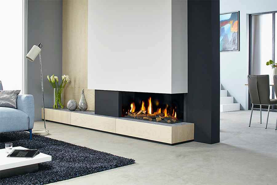 CHIMENEA 2 LADOS  100 ED,  es la versión de esquina del modelo  100ED de frente.  Modelo con amplia visión del fuego con gran rendimiento. Aporta una versatilidad adicional, ya que puede utilizarse como parte de una pared divisoria de habitaciones, transformando un espacio de vida convencional en un ambiente cálido y espectacular.