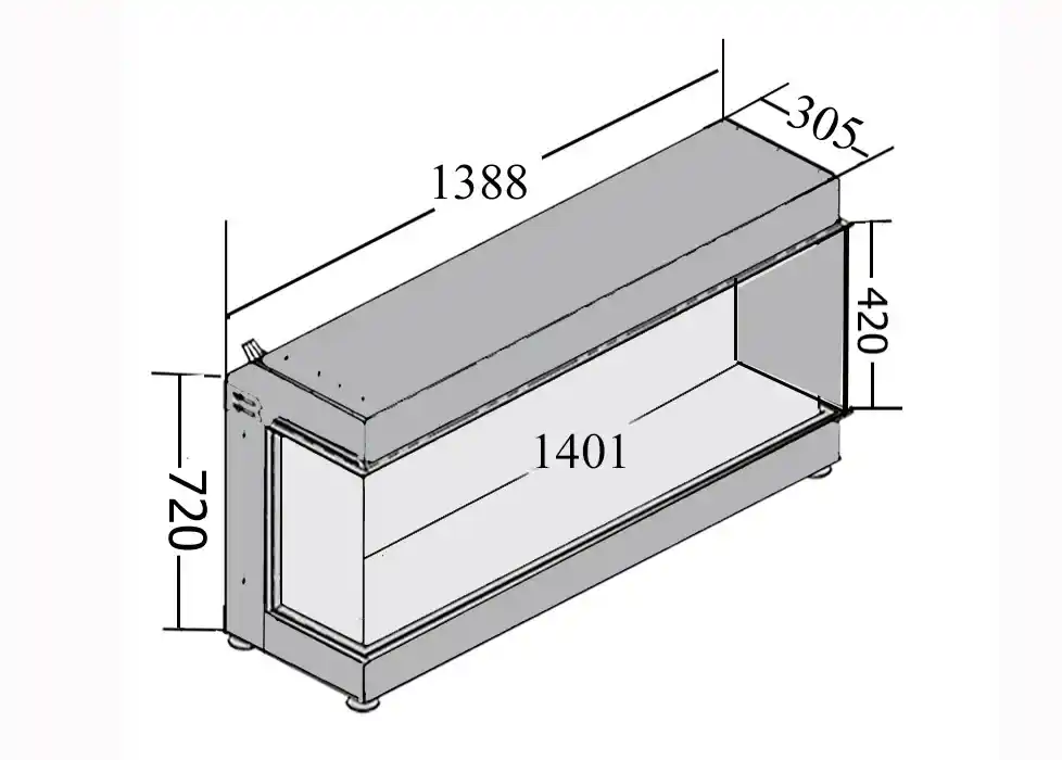 Chimenea Bioetanol Equina 1400, es decir dos lados vistos. Naturalmente tiene visión del fuego frontal y un lado, puede ser el lado izquierdo o derecho.