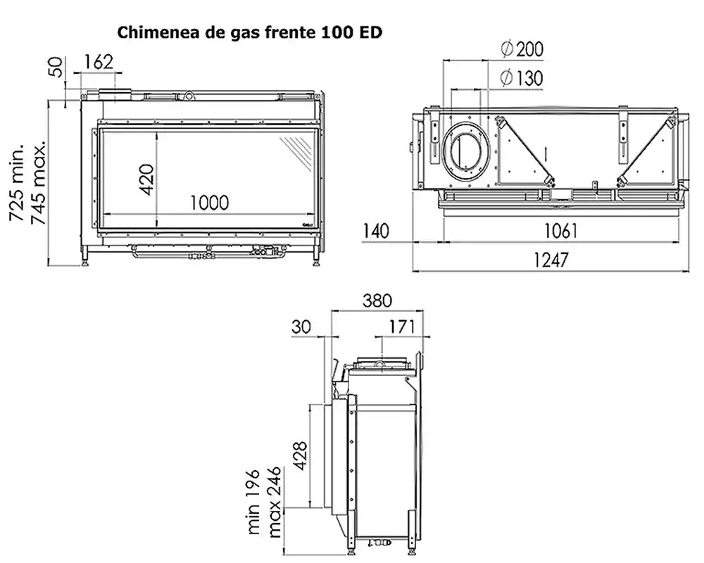PANORAMICA FRENTE GAS 100ED con interior color negro u opcional de Ceraglass negro o espejados. Se trata de un modelo con un sistema de combustion cerrado, es decir un sistema equilibrado que es adecuado para hogares sin chimenea y tiene una impresionante calificación de eficiencia energética del 88%. Para la combustión toma el oxigeno del exterior como asimismo expulsa los humos al exterior.