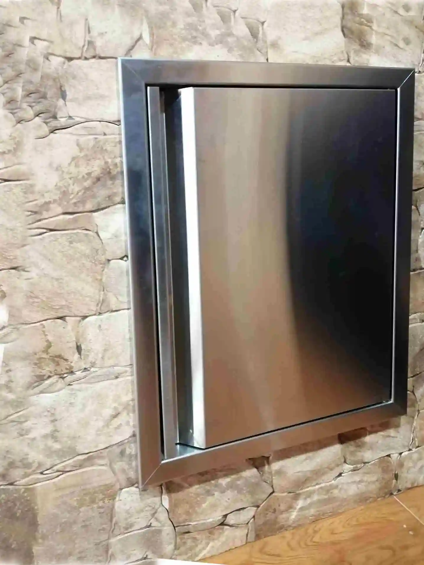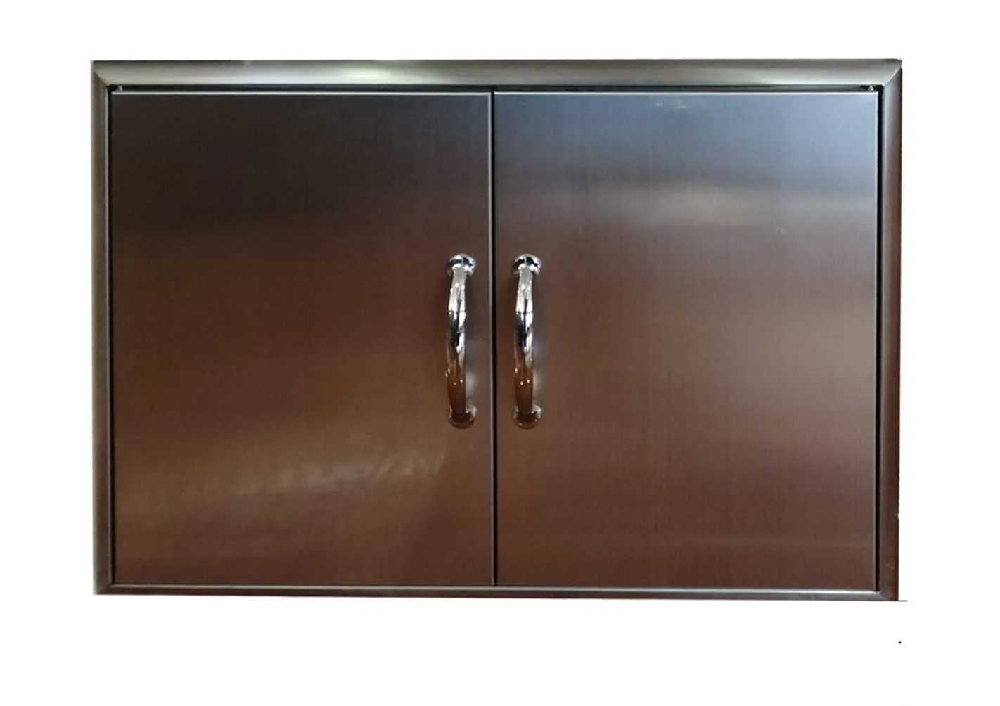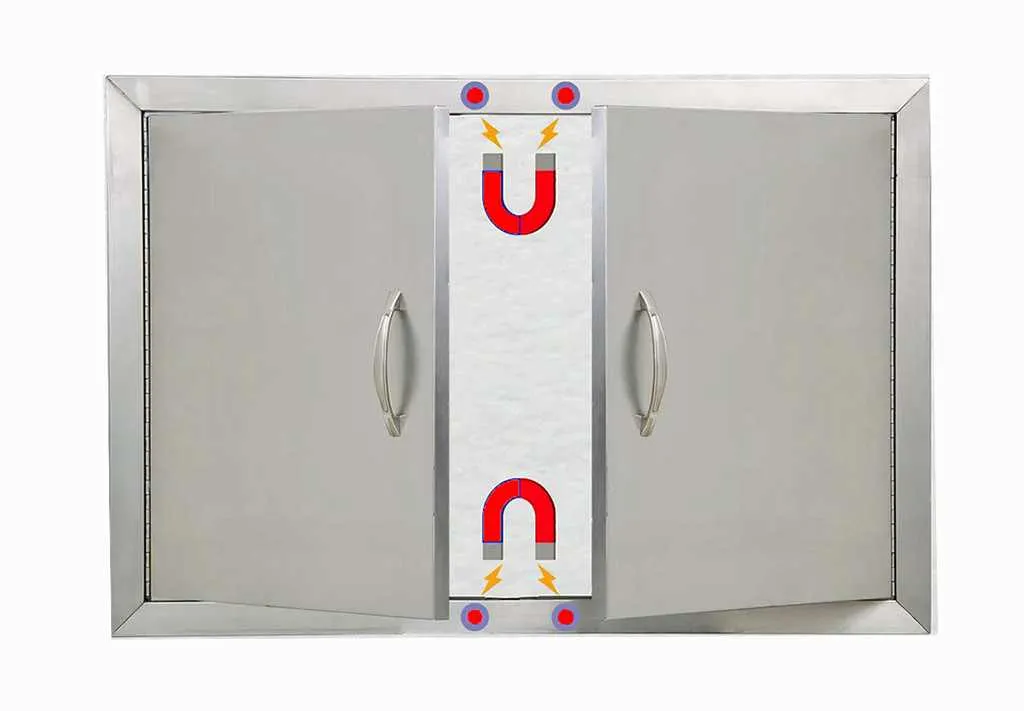 Puertas de acero inoxidable para cocinas de exterior. Puertas de fácil instalacion sin taladro, con superficie lisa para rápida limpieza. Maneta ergonómica para fácil acceso. Tamaños versátiles para varias configuraciones de cocina exterior.